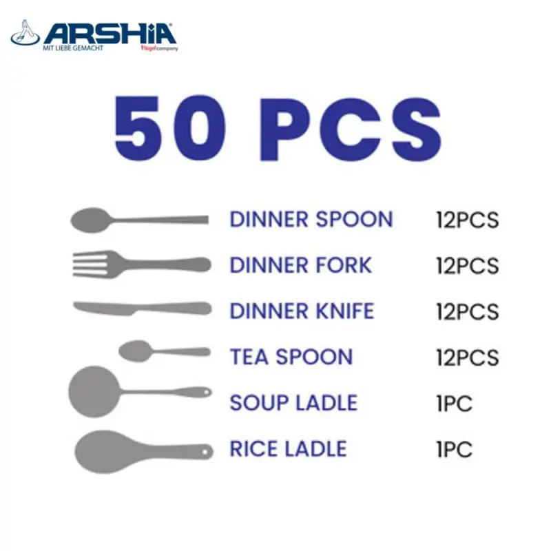 طقم أدوات مائدة فاخر من ARSHIA الألمانية – 50 قطعة لون فضي