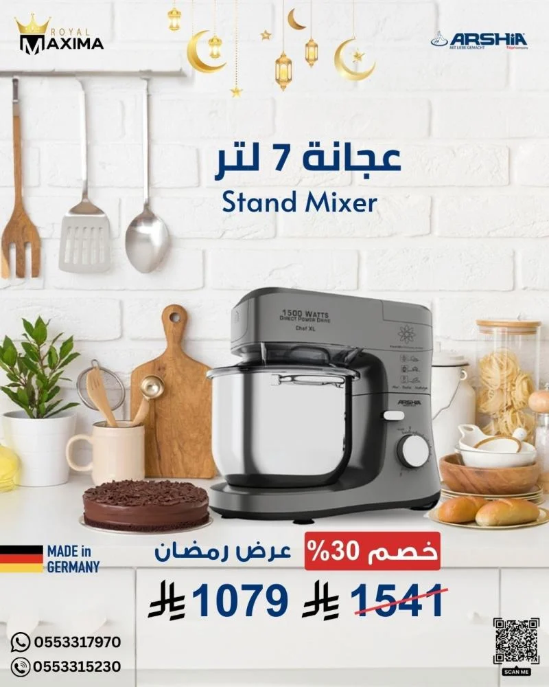 عجانة كهربائية – عجانة أرشيا – ARSHIA Mixer – أجهزة منزلية – أجهزة كهربائية – تكنولوجيا ألمانية – Royal Maxima – رويال ماكسيما – عروض رمضان – معدات مطبخ احترافية