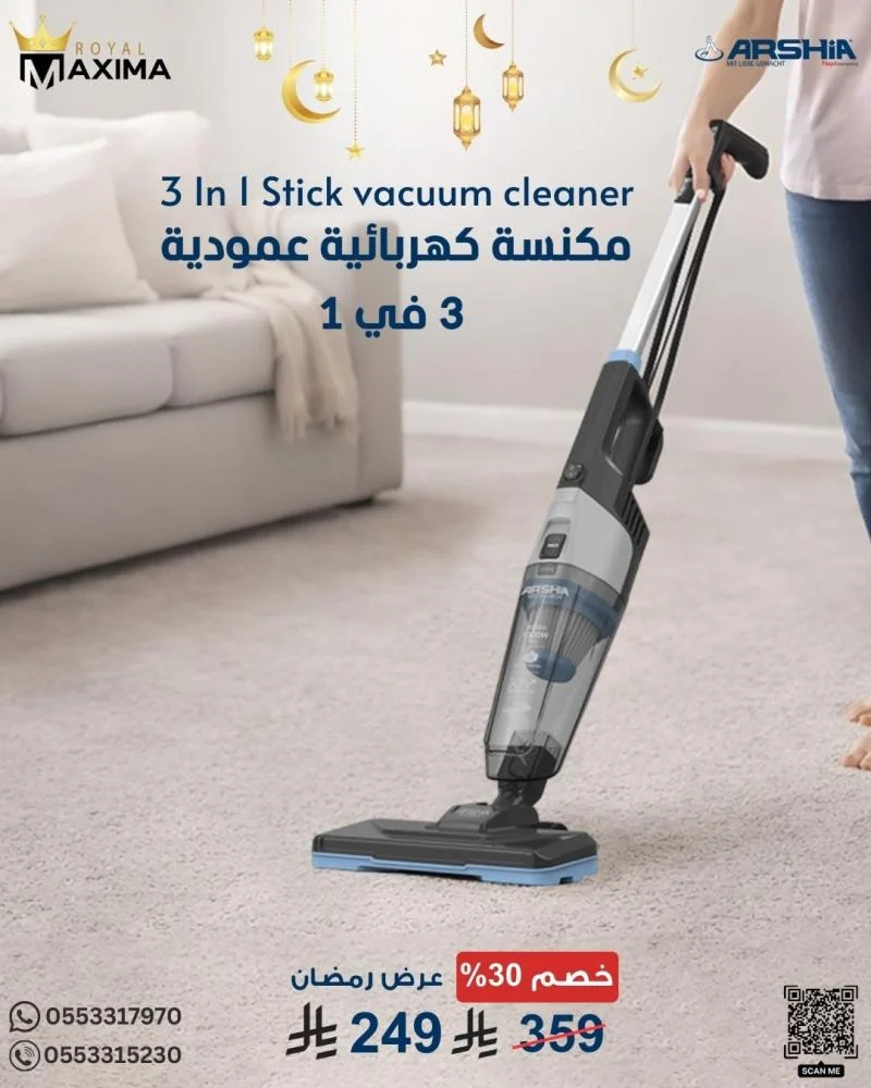 استمتعي بتنظيف منزلك بكل سهولة مع مكنسة Arshia العصرية 3 في 1، تجمع بين قوة الشفط العالية والتصميم الخفيف الذي يمكن أن يقف ذاتيًا، لتكون مثالية للتنظيف السريع والاستخدام اليومي 👌